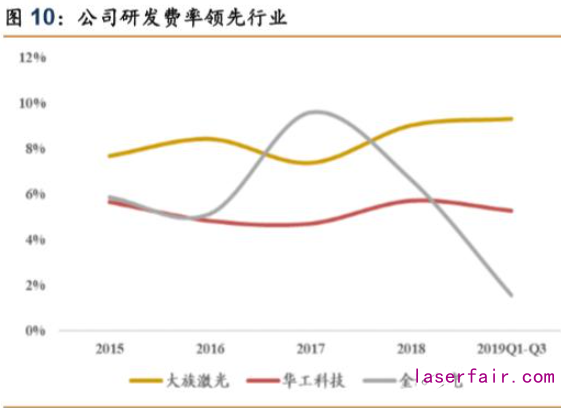研發投入持續高位,領先國內同行業企業。根據公司 2019 年三季報,公司 2019 前三 季度研發費率為 9.3%,同比+2.0pp,研發投入持續增長;橫向對比來看,國內激光設備行 業的華工科技同期研發費率為 5.3%、金運激光為 1.6%。