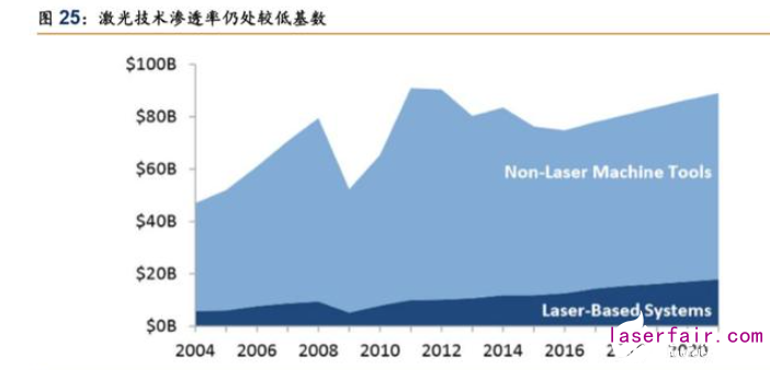 激光技術滲透率仍處低基數,行業天花板遠未達到。根據 IPG 公布的測算結果,目前全 球材料加工設備市場規模約 920 億美元,其中激光設備市場約 140 億美元,占比為 15%。 低滲透率基數為激光設備行業仍然保留了極大發展空間,行業天花板遠未達到。