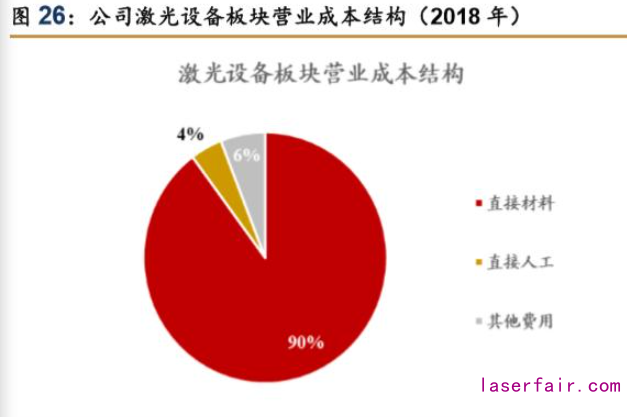 激光器為公司采購成本最高的上游元件。通過拆解公司激光設備板塊歷年成本結構,可 以看出直接材料成本占板塊營業成本約 90%。進一步拆分來看,激光器光源為最大細分項。 根據公司 2018 年發布的可轉債募集說明書中數據,公司外購的原材料主要包括激光器、電 機平臺、振鏡等。以 2017H1 為例,激光器、電機平臺、振鏡分別占公司原材料采購總額的 35.8%、4.8%、2.5%;從供應商來看,公司激光器主要采購自美國 IPG。
