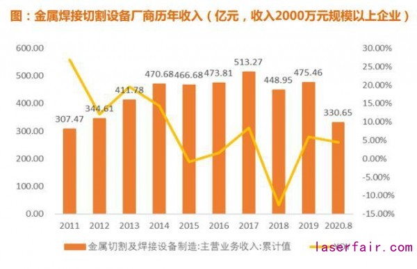 焊接市場(chǎng)空間廣闊,根據(jù)國(guó)家統(tǒng)計(jì)局?jǐn)?shù)據(jù),規(guī)模以上金屬焊接切割廠商年收入合計(jì)達(dá)到475.46億(2019年);