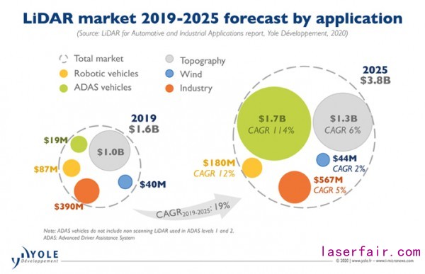 Yole技術和市場分析師Alexis Debray表示:“高級駕駛輔助系統(ADAS) 的LiDAR市場將實現114%的年增長率,從2019年的1900萬美元增長到2025年的17億美元。”(如圖1) 期望如此之高,但激光雷達市場面臨阻礙,急需大膽創新。