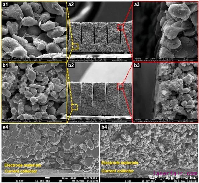 圖1.(a)石墨負極和(b)LCO正極的SEM;(a1)、(b1)和(a3)、(b3)是未成型和激光成型區域的放大圖。(a2)、(b2)是截面圖。(a4)、(b4)是電極集流體附近的圖像。