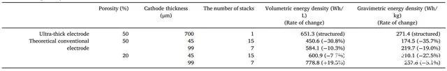 表1. 基于厚度和孔隙率,比較激光成型電極與傳統電極的體積和重量能量密度。