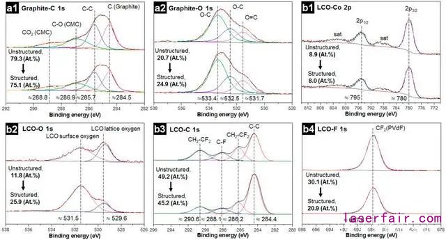 未成型和激光成型的石墨和LCO電極顯示類似的XPS光譜。對于石墨電池,C1s(石墨在284.5eV左右,CMC在288.8eV左右,見圖2(a1))降低歸因于激光燒蝕導致的部分粘結劑和活性材料去除。O 1s光譜也發生輕微變化,歸因于激光成型過程中電極表面發生氧化。盡管由于激光燒蝕導致C 1s和O 1s的原子百分比發生輕微變化,但是并沒有因為激光成型導致新峰出現。對于LCO電極,未成型和激光成型樣品的Co 2p光譜(在大約780eV的Co 2p3/2峰以及接近+10eV的衛星峰)沒有區別。