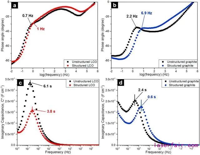 圖5. 在激光成型前后,使用(a) LCO和(b)石墨的波特圖進行離子擴散分析,以及(c) LCO和(d)石墨的虛電容曲線。