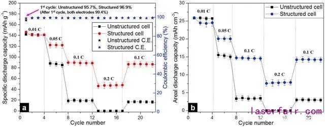 從未成型和激光成型的全電池的倍率性能和面容量可知,在低倍率(0.01C)下,放電容量幾乎與理論容量一樣(140mAh/g)。兩種電極顯示高而且幾乎相同的庫倫效率。在倍率增加時,仍然保持高庫倫效率。因此作者認為,未成型和激光成型電池能正常使用,不存在因厚電極制備過程造成的如內部裂縫、集流體剝離或電解液浸潤差的缺陷。當增加電流倍率時(從0.05C增加到0.2C),未成型電池的放電容量急劇降低。此外,未成型電池在0.2C的容量完全不可用。相反,激光成型電池在0.05C的放電容量比未成型電池高50%。當倍率增大時,兩者的差異進一步放大。激光成型電池的可用容量比未成型電池低約5%;這與質量損失吻合,其與激光燒蝕造成的容量損失直接正相關。在低倍率(0.05C)下,激光成型電池的可用容量比未成型電池高35%。在相對高倍率下(0.1C),激光成型電池的可用容量是未成型電池的5倍之多。