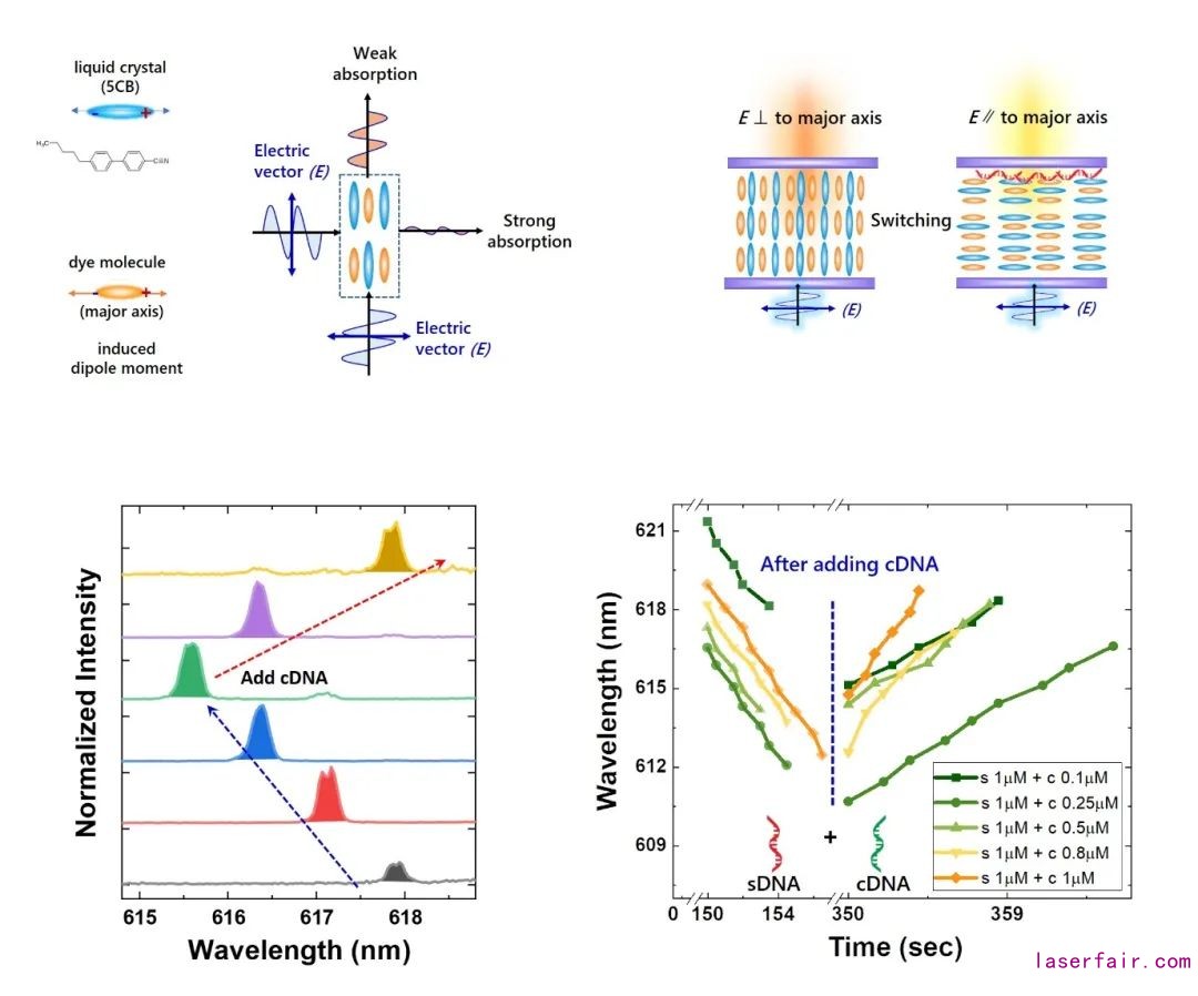 在此微腔中,增益介質(zhì)是由摻雜染料與液晶形成的主-客體復(fù)合材料。液晶的永久性偶極矩產(chǎn)生作用于染料的誘導(dǎo)偶極矩。因此染料的排列也會(huì)隨著液晶而改變。如圖三所示. 當(dāng)入射光的電矢量(E)垂直于染料分子的主軸時(shí),會(huì)發(fā)生弱吸收。當(dāng)入射光的電矢量(E)平行于染料分子的主軸時(shí),會(huì)發(fā)生強(qiáng)吸收。在注入了sDNA的F-P腔中加入cDNA之前和之后的激光切換。堿基開(kāi)始配對(duì)后,激光開(kāi)始返回原始波長(zhǎng)附近。