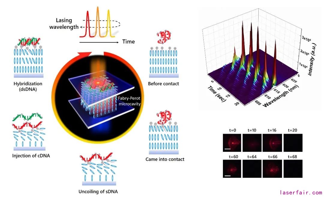法布里-珀羅微腔包含兩個(gè)反射鏡和在兩鏡之間的光學(xué)增益介質(zhì)。課題組采用摻了染料的液晶為增益介質(zhì),目的是為了增強(qiáng)對(duì)堿基配對(duì)的響應(yīng),并利用DNA-液晶特殊的互動(dòng),作為轉(zhuǎn)換原理來(lái)改變微腔中液晶的排列方向從而實(shí)現(xiàn)激光中不同波長(zhǎng)之間的切換。