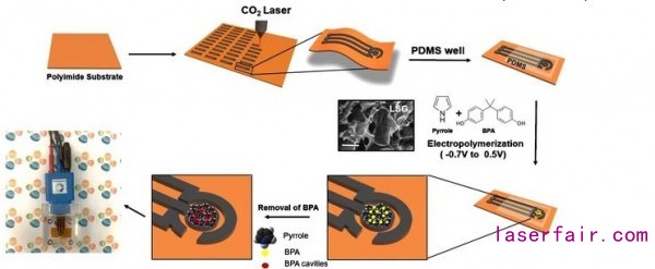 研究人員通過分子印記聚合物(molecularly imprinted polymers (MIPs))改變LDG(激光衍生石墨烯)來制造出廉價的傳感器用于探測水中和塑料樣品中的丙二酚。這一改性包括在存在BPA分子的時候在施加電壓的條件下合成聚吡咯,這作為模板和當移除的時候在聚合物中留下印記。在相似的基材條件下,傳感器對BPA的反應呈現出高度的敏感性和選擇性,諸如雌二醇(女性荷爾蒙),腎上腺素,丙二酚等。
