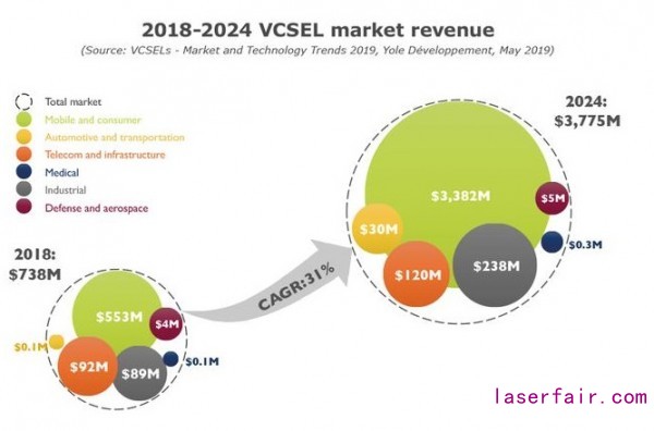 Yole預計VCSEL市場將從2019年的12.47億美元增長到2024年的37.75億美元,復合年增長率達31%。市場數據無疑證明了VCSEL是光子市場增長最快的細分領域之一。