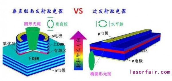 VCSEL本質上是一種半導體激光器,激光器是用來發射激光的裝置,而半導體激光器則是以半導體材料為工作物質發射激光的器件,根據激光芯片的結構,半導體激光器可分為邊發射激光器(EEL)和垂直腔面發射激光器(VCSEL)。