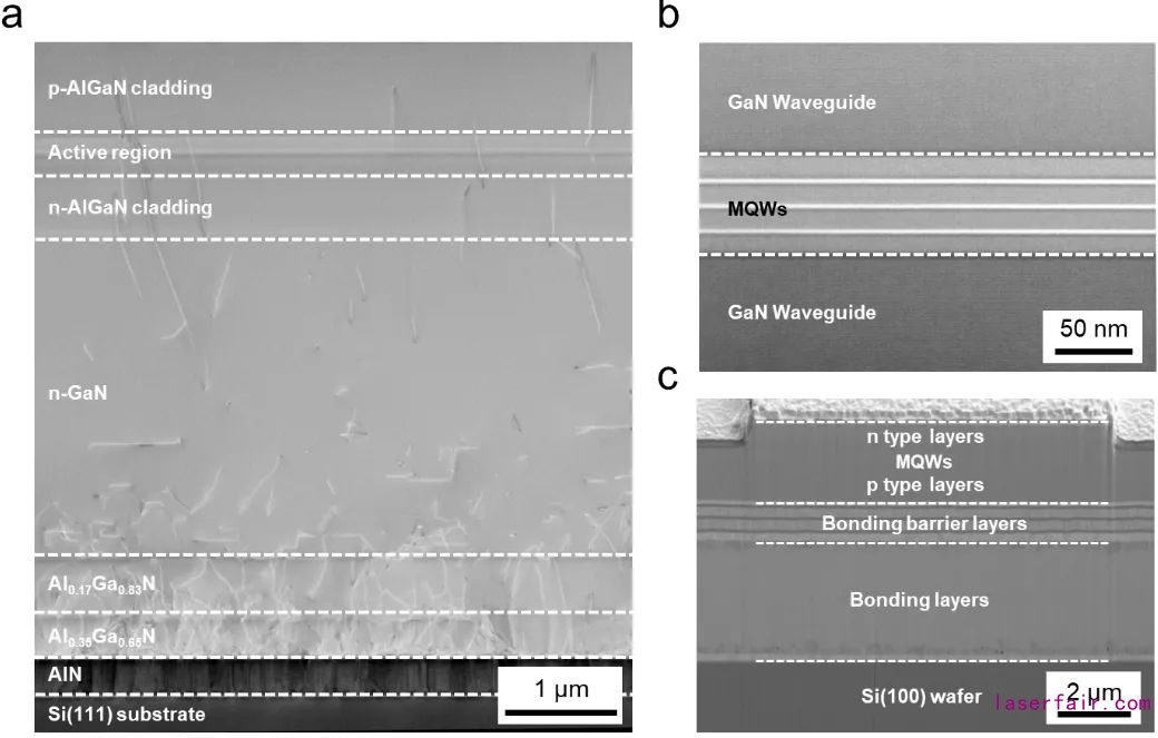 ??圖3. 硅基GaN翻轉脊形波導激光器的(a)掃描透射電子顯微鏡(STEM)圖,(b)有源區的STEM圖,(c)激光器腔面的掃描電子顯微鏡(SEM)圖。