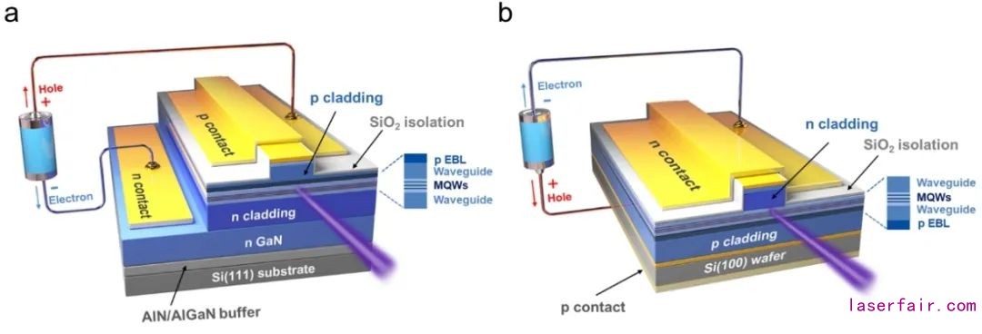 圖2. (a) GaN基常規脊形波導激光器和(b)翻轉脊形波導激光器結構示意圖。