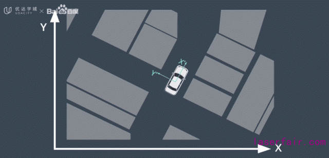 在地圖上也有可能找到車輛傳感器所檢測(cè)到的地標(biāo),為估計(jì)車輛在地圖上的位置,我們將傳感器的地標(biāo)觀測(cè)值與這些地標(biāo)在地圖上的位置進(jìn)行匹配,地圖自帶坐標(biāo)系,無(wú)人駕駛軟件必須將傳感器的測(cè)量得到的在車輛坐標(biāo)系中的坐標(biāo),轉(zhuǎn)換為地圖坐標(biāo)系中的坐標(biāo)(見(jiàn)圖4),執(zhí)行這類轉(zhuǎn)換是解決定位問(wèn)題的關(guān)鍵步驟。