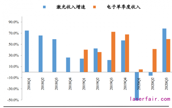 ③微觀(guān):IPG中國(guó)區(qū)收入降幅自2019Q4開(kāi)始收窄,2020Q3已扭轉(zhuǎn)下跌趨勢(shì),同比+22%。激光和電子Q1以來(lái)訂單需求旺盛,收入增速環(huán)比提升顯著,Q3激光收入環(huán)比+78.28%,電子收入環(huán)比+59.42%。