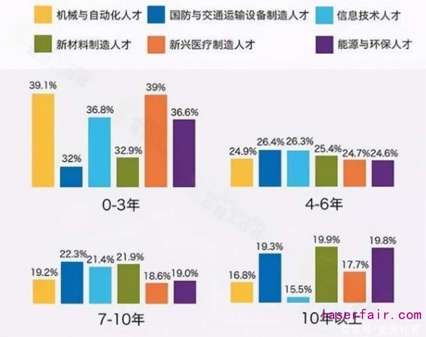 有相關的數據顯示,國內的制造業相關的6類行業中人才數目達到248萬,而其中機械與自動化人才信息技術人才占有多數。同時機械制造業的人才從業年數隨著年限的增長數量也是在逐漸減少。