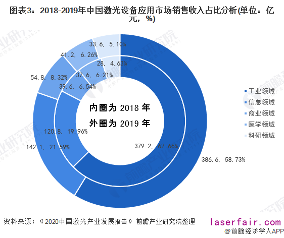 我國(guó)激光設(shè)備主要應(yīng)用在工業(yè)、信息、商業(yè)、醫(yī)學(xué)以及科研領(lǐng)域。根據(jù)《2020中國(guó)激光產(chǎn)業(yè)發(fā)展報(bào)告》的數(shù)據(jù)顯示,2019年工業(yè)領(lǐng)域激光設(shè)備銷售收入達(dá)到386.6億元,占總收入的58.73%,仍居于首位;其次是信息領(lǐng)域激光設(shè)備,實(shí)現(xiàn)銷售收入為142.1億元;而激光設(shè)備在醫(yī)學(xué)領(lǐng)域的市場(chǎng)份額僅為6.26%,實(shí)現(xiàn)銷售收入41.2億元。