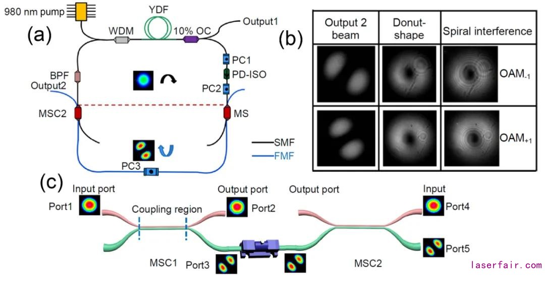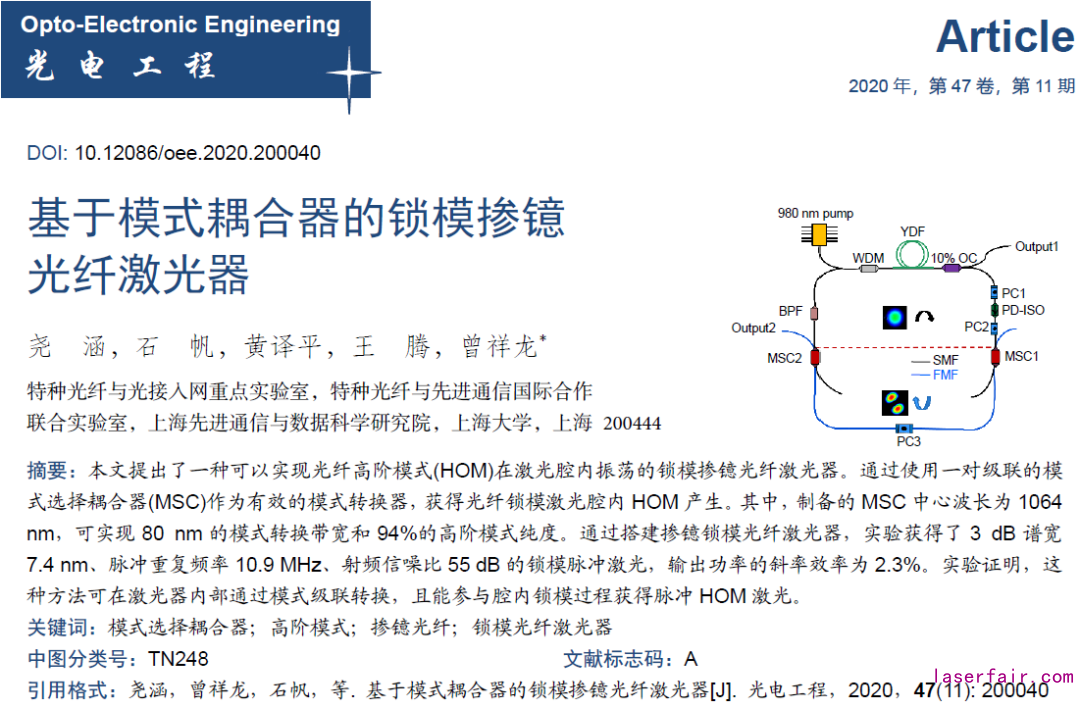 研究團隊提出了一種可以實現光纖高階模式(HOM)在激光腔內振蕩的鎖模摻鐿光纖激光 器 1。通過使用一對級聯的模式選擇耦合器(MSC)作為有效的模式轉換器,在1.0 μm波長處獲得腔內HOM振蕩的光纖鎖模激光。該方法能夠在少模光纖腔內摻鐿光纖激光器實現鎖模脈沖,并在腔內激光振蕩純度高的高階模式脈沖激光。
