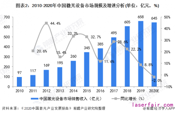 根據(jù)2020年3月27日,中國科學院武漢文獻情報中心牽頭編寫的《2020中國激光產(chǎn)業(yè)發(fā)展報告》發(fā)布的數(shù)據(jù)顯示,2010-2019年我國激光設備市場規(guī)模呈現(xiàn)逐年增長增長態(tài)勢。其中,2019年我國激光設備市場實現(xiàn)銷售收入達658億元,同比增長8.8%,增速有所放緩。值得注意的是,受到2020年冠肺炎疫情的影響,全球經(jīng)濟走勢不明朗,《2020中國激光產(chǎn)業(yè)發(fā)展報告》預計2020年中國激光設備市場整體銷售收入將會出現(xiàn)10年來首次負增長,約為645億元。
