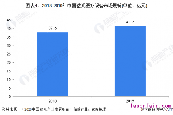 前瞻結合醫(yī)學領域激光設備銷售收入占比以及激光設備市場規(guī)模來看,2018-2019年我國激光醫(yī)療設備市場規(guī)模呈現(xiàn)增長趨勢,2019年我國激光醫(yī)療設備的市場規(guī)模為41.2億元。
