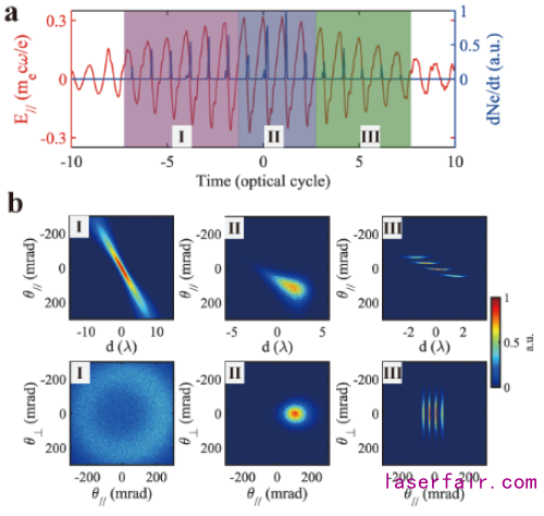 圖2.電子在光場下相位分布圖(a)與電子空間分布圖(b)。圖2展示了不同空間分布電子在光場相位下分布及空間分布。周期性發射的阿秒電子脈沖在激光場調制下形成了條紋結構分布,這一作用過程把電子按時間的先后順序轉換成了空間投影,根據電子空間分布可直接反演其阿秒時間動力學過程。