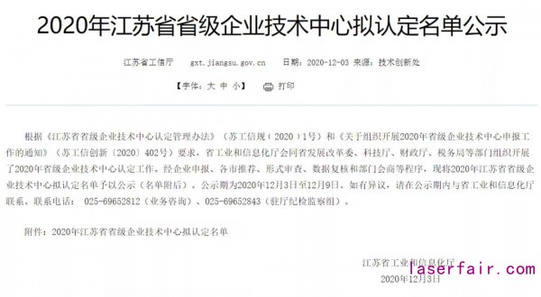 近期,江蘇省工業和信息化廳公布了《2020年江蘇省省級企業技術中心擬認定名單》,熱烈祝賀天弘激光光榮上榜!