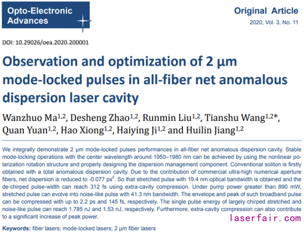 該研究成果以“Observation and optimization of 2 μm mode-locked pulses in all-fiber net anomalous dispersion laser cavity”為題,發表在Opto-Electronic Advances2020年第11期。文章受到國家自然科學基金支助,論文第一作者為課題組青年教師馬萬卓博士,通信作者為王天樞教授。