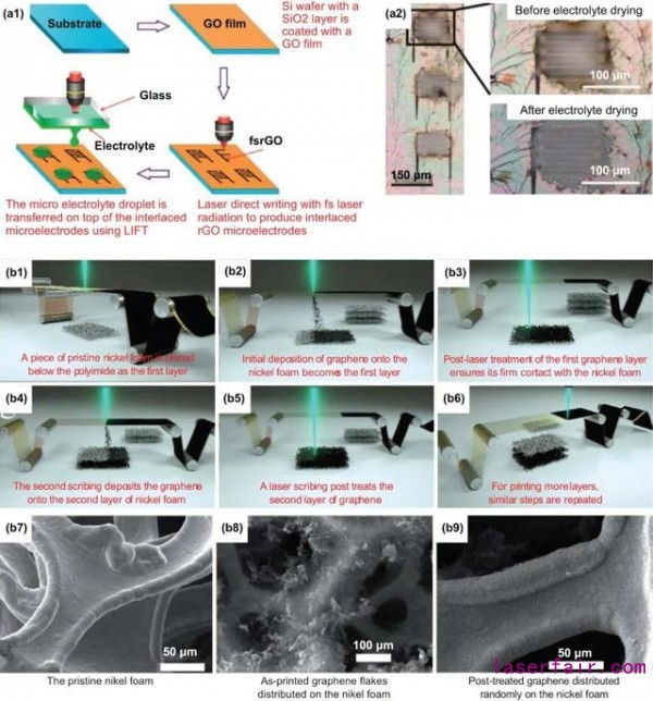 圖5 (a1) 激光直寫和LIFT用于制造的工藝流程圖 (a) 超微型的石墨烯微型超級電容器; (b1)–(b6) 制造石墨烯/鎳基泡沫電極的工藝流程, (b7)–(b9) 在不同階段的鎳基泡沫的顯微結構