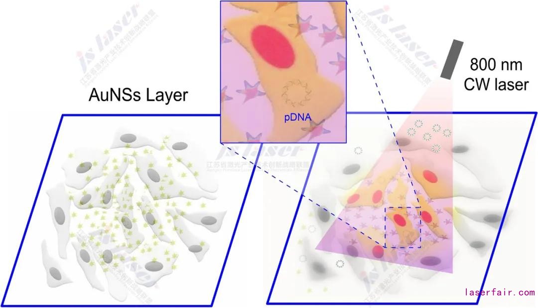 圖4 一個以AuNS層為介導的等離子體光穿孔平臺在激光輻照的前提下用于生物分子的輸送輸送至粘附細胞