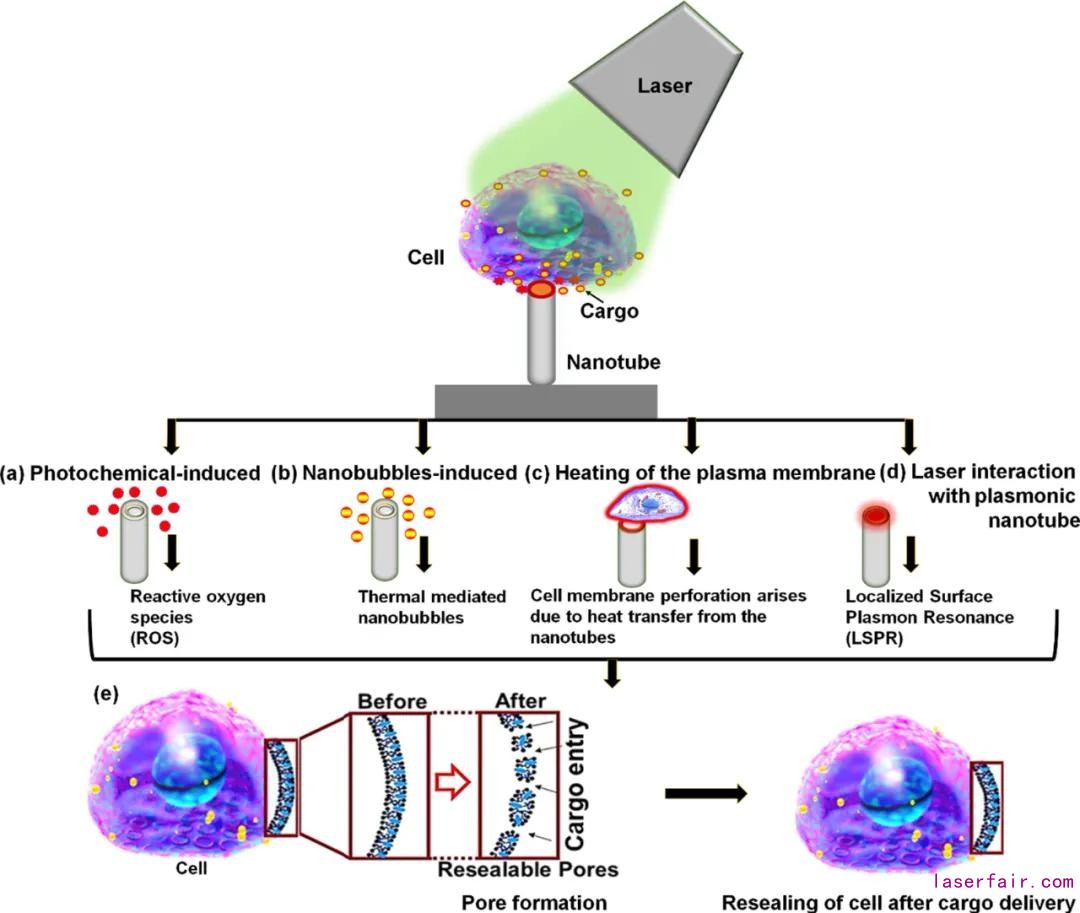 細胞膜穿孔的可能的機理包括:熱介導納米氣泡,光化學誘導活性氧,自納米管到細胞膜的熱傳遞,在這一納米管局部表面等離子體共振強電磁場等.這就導致在每一個細胞膜-納米管的界面上空化納米氣泡的形成,將會快速的生長,合并和坍塌,從而導致爆炸,導致細胞膜的穿孔,這促進生物分子自細胞外部到細胞內部進行輸送.這一在二氧化鈦納米管為基礎的輔助光穿孔的細胞間的輸送的精準的機理仍然不清楚.細胞間的輸送也許是幾個不同機理的混合效應,豐橋技術科學大學的L. Mohan說到.