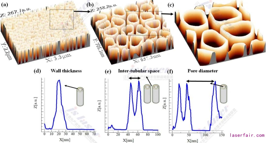 圖3 氧化鈦納米管在15 V@2 h的條件下形成的3D圖 (a-c) 和 2D (d-f) 圖