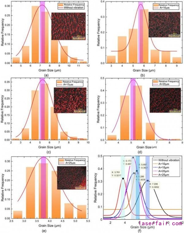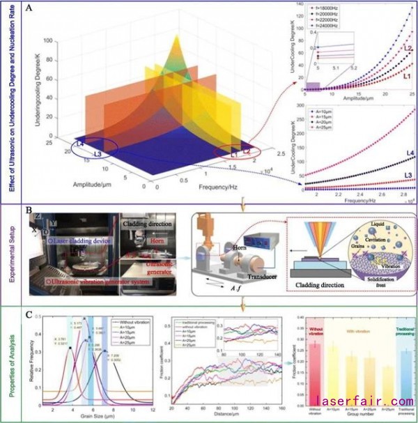 需要注意的是,過(guò)冷度的程度是一個(gè)非常重要的參考指標(biāo),直接影響到激光熔覆層的顯微組織的分布和機(jī)械性能。然而,超聲波振動(dòng)幅度對(duì)顯微組織和機(jī)械性能的影響很少報(bào)道。因此,基于過(guò)冷度的影響程度和孕育速率的的相關(guān)理論,超聲波振動(dòng)幅度對(duì)顯微組織(晶粒尺寸,析出相結(jié)構(gòu))和機(jī)械性能(顯微硬度和摩擦性能)的影響進(jìn)行了研究,同時(shí)對(duì)沒(méi)有施加超聲波的情形進(jìn)行了對(duì)比。