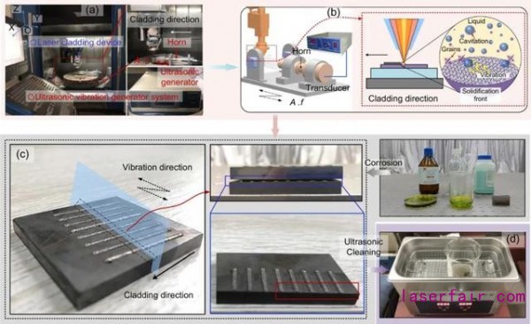 激光熔覆在金屬部件成形和制備涂層以及修復(fù)等方面具有非常明顯的優(yōu)勢(shì)。然而,隨之而來(lái)的是,其顯微組織中的內(nèi)部缺陷和機(jī)械性能較差等問(wèn)題,尚需要進(jìn)一步的開(kāi)展研究。在這里,來(lái)自沈陽(yáng)東北大學(xué)的研究人員,采用超聲波輔助加工的辦法進(jìn)行激光熔覆來(lái)提高熔覆部件的性能。基于超聲波的聲化和空化效應(yīng)對(duì)金屬凝固過(guò)程中所起的作用,振動(dòng)參數(shù)對(duì)熔池金屬的過(guò)冷度和孕育速率進(jìn)行了研究。