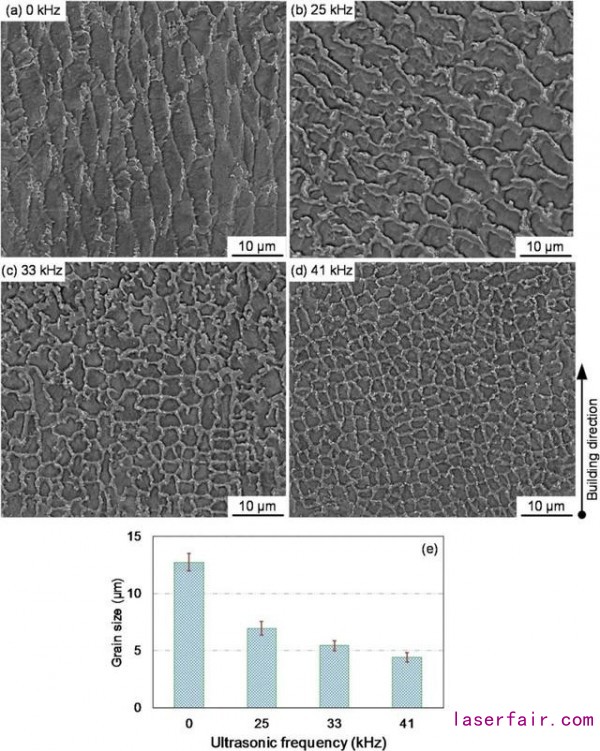 在近年來(lái),超聲波振動(dòng)不僅僅應(yīng)用在減材制造中,同時(shí)還應(yīng)用在熔化金屬的凝固當(dāng)中,如鑄造,弧焊和表面涂層等。超聲波,作為一種能量波,會(huì)產(chǎn)生聲化和空化效應(yīng),作為輔助激光熔覆的工藝,可以通過(guò)改變?nèi)垠w金屬的過(guò)冷和孕育速率而影響熔體的結(jié)晶。在最近的報(bào)道中,超聲振動(dòng)在提高金屬的凝固組織和液態(tài)金屬的凝固過(guò)程等方面具有強(qiáng)烈的優(yōu)勢(shì)。Komarov等人注意到在超聲振動(dòng)的時(shí)候,超聲的空化和聲化效應(yīng)對(duì)液態(tài)金屬的結(jié)晶和凝固過(guò)程的影響。由于這些效應(yīng)的作用,高頻振動(dòng)可以實(shí)現(xiàn)細(xì)化顯微組織,減少氣孔和提高元素成分的均勻性。Cong和Ning 等人實(shí)施了一系列的關(guān)于超聲輔助激光熔覆的實(shí)驗(yàn),結(jié)果顯示晶粒尺寸隨著超聲頻率的增加而下滑。此外,界面之間的結(jié)合變得更加平滑。在近年來(lái),一些研究表明晶粒尺寸的減少是孕育過(guò)程中驅(qū)動(dòng)力的作用造成的。