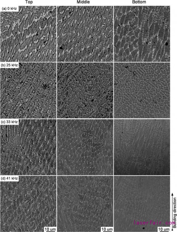 在超聲輔助激光熔覆的過(guò)程中,聲壓隨著超聲波的施加而周期性的變化。基于聲壓的變化,過(guò)冷度的程度和孕育速率隨著超聲波的振動(dòng)幅度和頻率的增加而增加。同沒(méi)有施加超聲振動(dòng)的激光熔覆相比較,柱狀晶主要集中在熔覆層的底部。熔覆層的中間和頂部隨著超聲波的施加變成了等軸晶。隨著振動(dòng)幅度的增加,晶粒尺寸得到了顯著的細(xì)化,Laves相的數(shù)量和成分(Nb和Mo)降低。