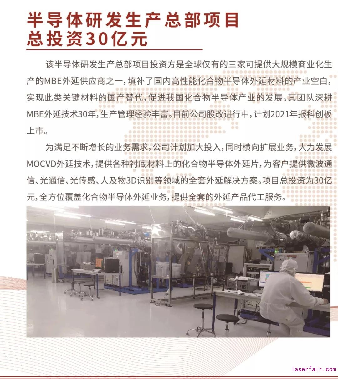 新簽約項目包括半導體研發生產總部項目、識光芯科激光雷達芯片項目、愛思微紅外傳感器研發中心等。其中,半導體研發生產總部項目總投資30億元,全方位覆蓋化合物半導體外延業務。據介紹,該項目投資方是全球僅有的三家可提供大規模商業化生產的MBE外延供應商之一,填補了國內高性能化合物半導體外延材料的產業空白,實現此類關鍵材料的國產替代,促進我國化合物半導體產業的發展。目前公司股改進行中,計劃2021年報科創板上市。
