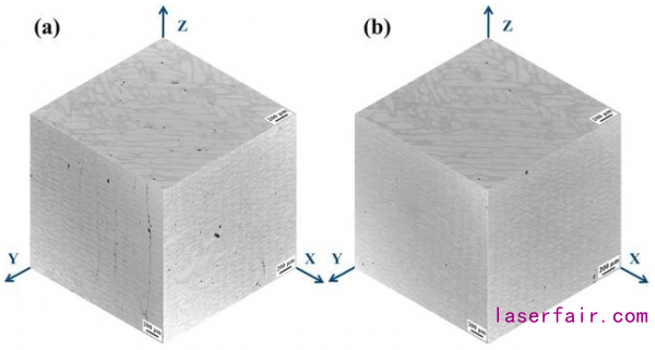 圖 1 SLM制造的鋁合金的3D金相組織圖:(a)Al-Cu-Mg 合金;(b)Ti/Al-Cu-Mg 合金,(Z表示的是制造方向)