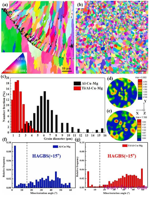圖3 SLM制造的合金的側(cè)視圖的EBSD方位圖:(a) Al-Cu-Mg和 (b) Ti/Al-Cu-Mg 樣品; (c) 晶粒尺寸的分布,極圖表面SLM制造的合金的方位 (d) Al-Cu-Mg 和 (e) Ti/Al-Cu-Mg合金; 以及合金樣品的錯(cuò)位角度的分布 (f) Al-Cu-Mg 和 (g) Ti/Al-Cu-Mg樣品.