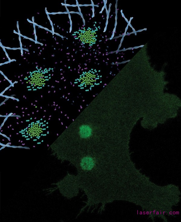 在實(shí)驗(yàn)室里,研究人員人工設(shè)計(jì)了一些“細(xì)胞”,這些“細(xì)胞”表面有大約300000個(gè)Y2受體,生長在專門開發(fā)的感光基質(zhì)上。每個(gè)Y2受體都有一個(gè)小分子的“標(biāo)簽”。一旦科學(xué)家們?cè)诩?xì)胞表面產(chǎn)生了一個(gè)帶有精細(xì)激光束的光點(diǎn),這個(gè)光點(diǎn)下的Y2受體就通過分子標(biāo)記被捕獲到暴露的基質(zhì)上,從而使Y2受體緊密地結(jié)合在一起,形成一個(gè)稱為簇的組裝體。整個(gè)反應(yīng)可以立即在規(guī)定的地點(diǎn)和幾秒鐘內(nèi)觀察到。