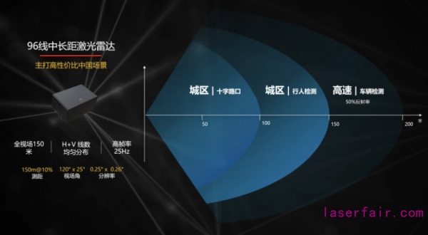 華為2020年12月21日發布的MEMS混合固態激光雷達,采用905nm激光器,分辨率為96線,擁有全視場景150米的測距能力,大視野120°x 25°,滿足城區、高速等場景的人、車測距需求;全視野中,水平、垂直線束均勻分布,不存在拼接、抖動等情況,形成穩定的點云對后端感知算法友好;小體積,滿足前裝量產車型需求。