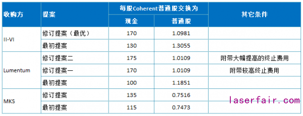 在做出此決定前,Coherent收到了Lumentum的修訂提案和MKS Instrument, Inc.(納斯達克:MKSI)的修訂提案。根據Lumentum修訂提案之一的條款,交易完成后,Coherent普通股的每股將交換為175美元現金和1.0109股Lumentum普通股,同時作為接受競爭性收購方案的條件,將附帶大幅提高的終止費用。根據Lumentum另一份修訂提案的條款,交易完成后,Coherent普通股的每股將交換為170美元現金和1.0109股Lumentum普通股,同時作為接受競爭性收購方案的條件,將附帶較高的終止費用。根據MKS的修訂提案,交易完成后,Coherent普通股的每股將交換為135美元現金和0.7516股MKS普通股(視情況而定)。
