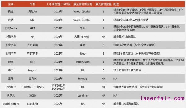今年1月以來,蔚來、上汽和長城等自主品牌陸續(xù)發(fā)布新車型,均將搭載固態(tài)/半固態(tài)激光雷達。蔚來ET7將搭載Innovusion配套的激光雷達;上汽智己其軟硬件架構(gòu)冗余方案能夠兼容3個激光雷達;長城的咖啡智能平臺首款車型“摩卡”將搭載Ibeo配套的激光雷達;寶馬、豐田、沃爾沃、小鵬均宣布未來新車型將搭載激光雷達。