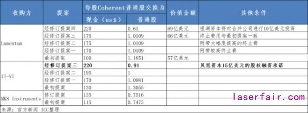 作為該提案的回應,II-VI公司給出的競爭性提案是Coherent股東的每股獲得220美元的現金和0.91的II-VI普通股,Coherent股東將持有合并公司大約18%的普通股,新提案還帶來了私人股權投資機構貝恩資本(Bain Capital)15億美元的股權融資承諾。II-VI相信雙方合并將帶來更大規模的降低成本,增強競爭力,以及互補的技術平臺將帶來令人興奮的新機遇。
