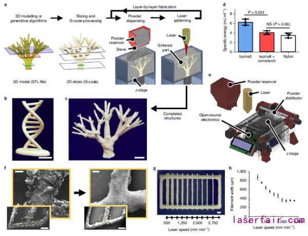 實驗中使用的是糖犧牲材料的基礎成分是異麥芽粉(Isomalt powder),但是異麥芽粉與標準激光燒結材料(如尼龍)相比具有更高的粘性(圖1d),需混合抗凝結劑(二氧化硅,玉米淀粉和黃原膠)以稀釋其粘性。然后糖粉末由粉末分裝器和振動篩槽均勻地噴灑在指定區域,通過激光燒結構筑成型(圖1a)。所構建的糖支架具有異質3D分支,曲率光滑和無支撐幾何體的特性(圖1b)。該支架同時具有一定的硬度和脆性,其彈性模量約為600MPa,足以支撐其自身重量并完成后續的水凝膠灌注。該團隊還更新了OpenSLS的硬件和固件,使其能編碼區域特定的燒結參數,更適合進行糖粉的激光燒結(圖1e)。