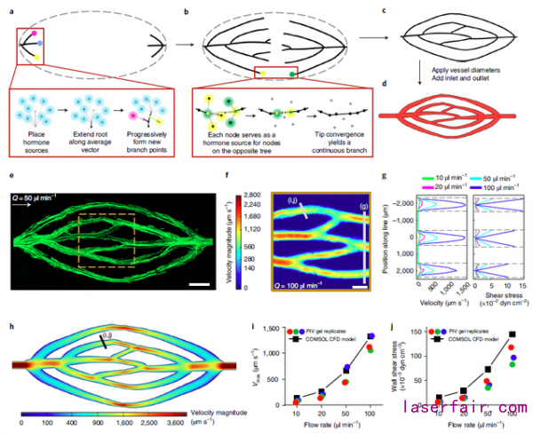 為模擬生理條件下的動脈-靜脈血管網絡,該團隊采用了葉脈分支模型來計算分支血管拓撲結構。簡言之,在一個橢圓模型內假定兩個葉脈生長點并假定其隨機延伸(圖3a),當兩個生長束接近時,它們的末端分支相互吸引(圖3b)并會聚形成閉合網絡(圖3c)。但是網絡管道厚度的計算遵從Murray定律而獨立于葉脈網絡生長步驟(圖3d)。經過對該網絡的流動性評估后發現,該網絡可以有效地將流量分布在所有通道中(圖3e),即分叉的流體在分支中呈現出較低的速度,而會聚的流體獲得速度則是分支速度之和(圖3f)。另外,研究結果表明通道中的最大速度和壁面剪應力是一致的,證明了整個網絡中的流體流動是均勻分布的(圖3g)。該團隊還發現通過標準計算流體力學(CFD)可模擬上述流動性評估結果,于是提出了將CFD用于模擬和預測血管流動性的可能。文章作者最后通過檢查三個單獨的粒子圖像測速(PIV)實驗,證明了該網絡構建的可重復性(圖3i,圖3j)。