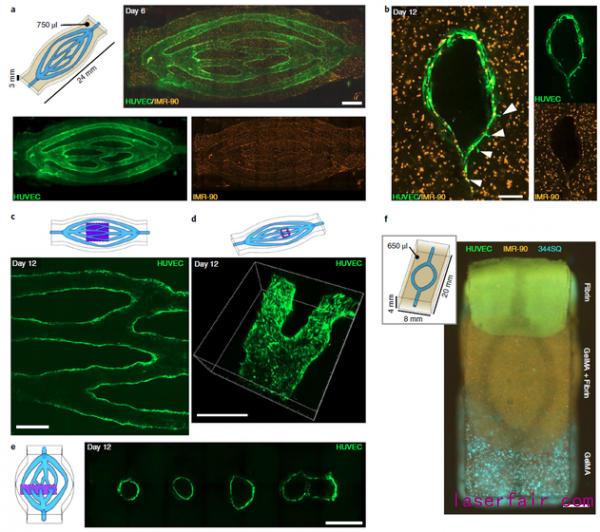 在獲得穩定構建血管網狀結構的工藝參數后,該團隊開始進行載細胞實驗。血管網外層水凝膠中混有被mOrange標記的IMR-90成纖維細胞,血管通道內皮通過灌注種植GFP標記的內皮細胞(HUVEC)。經過11天的灌注培養后,結果發現HUVEC在管腔內長勢良好,并有向水凝膠內萌發的趨勢。進一步的評估表明,HUVEC均勻地覆蓋在網絡的各個分支(圖4c,圖4d)和通道的整個周長(圖4e)周圍。接下來,該團隊在同一個血管網糖支架上的不同區域用不同的水凝膠包裹,構建出一個液體互通的異源材料血管網組織模型,證明了糖支架激光燒結技術在構建不同組織交界面模型的潛力(圖4f)。