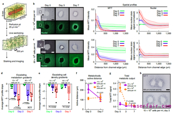 為深入了解灌注水凝膠中不同細胞密度下的代謝活性,該團隊通過激光燒結技術制造單管道水凝膠(圖5a)。水凝膠中混合不同密度的HepG2肝細胞,在第0天、第3天、第7天后通過MTT染色研究細胞代謝活性。結果發現,靠近單管道的細胞一直維持較高的代謝活性而其他區域的代謝活性從第3天開始減弱(圖5b,c)。對低細胞密度水凝膠的研究顯示,從第3天開始管道附近的細胞密度、代謝活性(圖5d,圖5e)開始加速上升,而高細胞密度水凝膠中第3天和第7天的細胞密度沒有顯著變化,可能原因是水凝膠中細胞密度過高而很快達到飽和。同時第7天的結果還表明,在不同細胞密度的水凝膠中其代謝活性半徑和總代謝水平隨著時間的推移趨于相同(圖5f,圖5g),并總結了細胞活性與通道距離之間的簡單函數關系(圖5h)。
