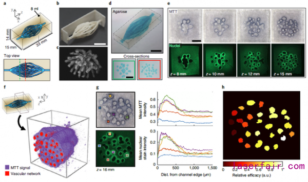 該團隊同樣通過燒結技術構建樹突狀血管網支架并包埋于2%瓊脂糖膠中,并驗證了該結構的通道流動性(圖6a – 圖6d)。然后,將該支架包埋于載HepG2細胞的水凝膠中,觀察到3天后樹突狀網絡周圍細胞代謝活性增強(圖6e)。該團隊進一步開發了一個圖像處理工作流程,將整個凝膠的代謝活動進行可視化,并發現樹突狀血管網存在灌注不充分的區域。其可能原因是該區域上游管道本身灌注不足導致的(圖6f – 圖6h)。