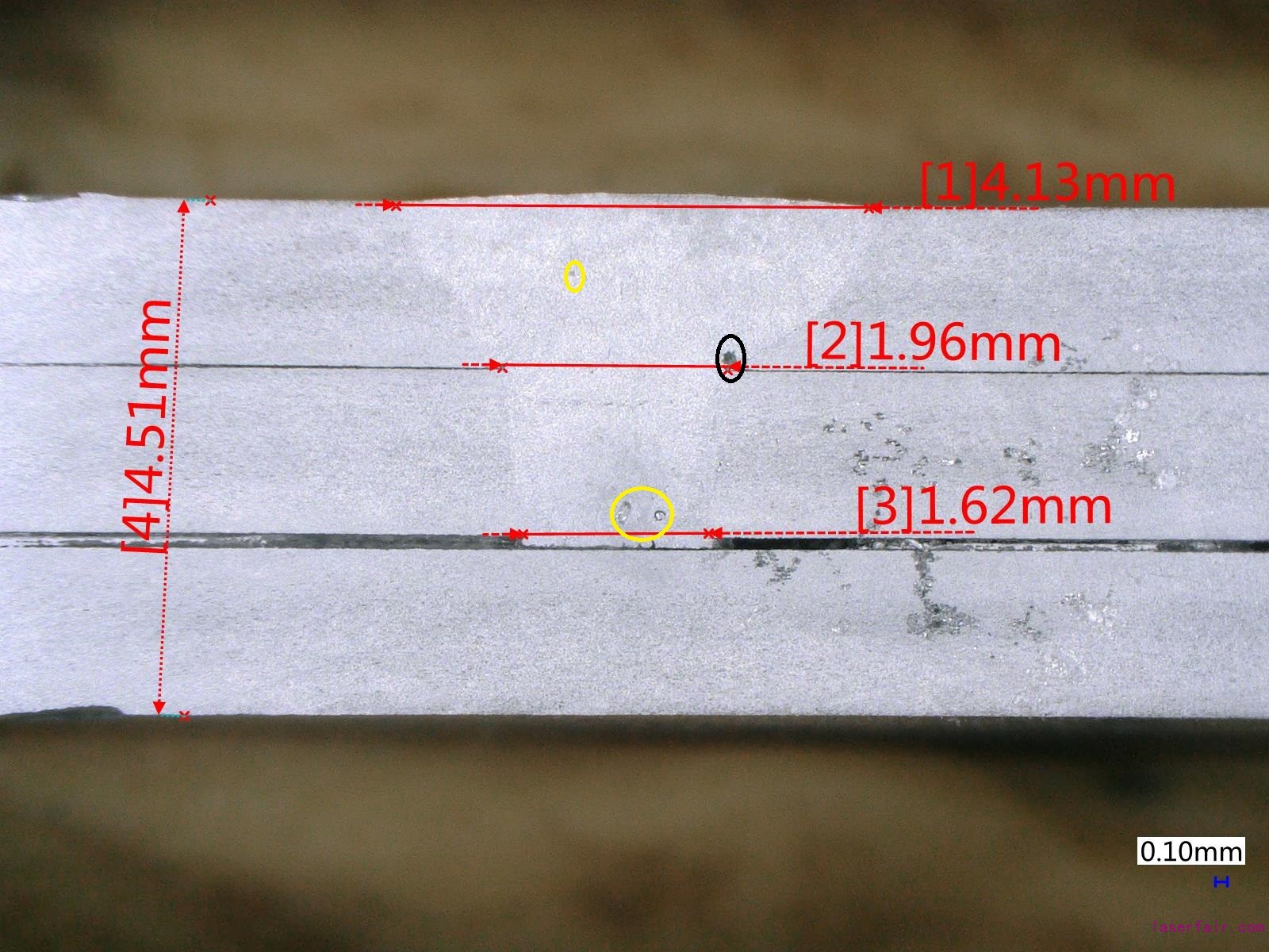 黑圈內是由于試板間隙造成的孔,黃圈內為氣孔