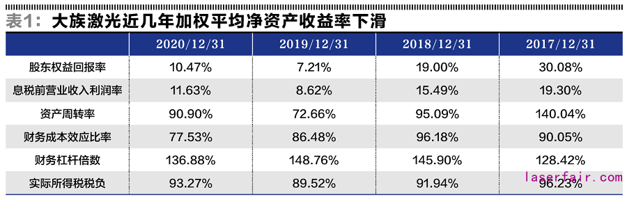 然而,與券商研報(bào)和公司年報(bào)形成對比的,則是大族激光最近幾年的加權(quán)平均凈資產(chǎn)收益率的下滑(見表1)。
